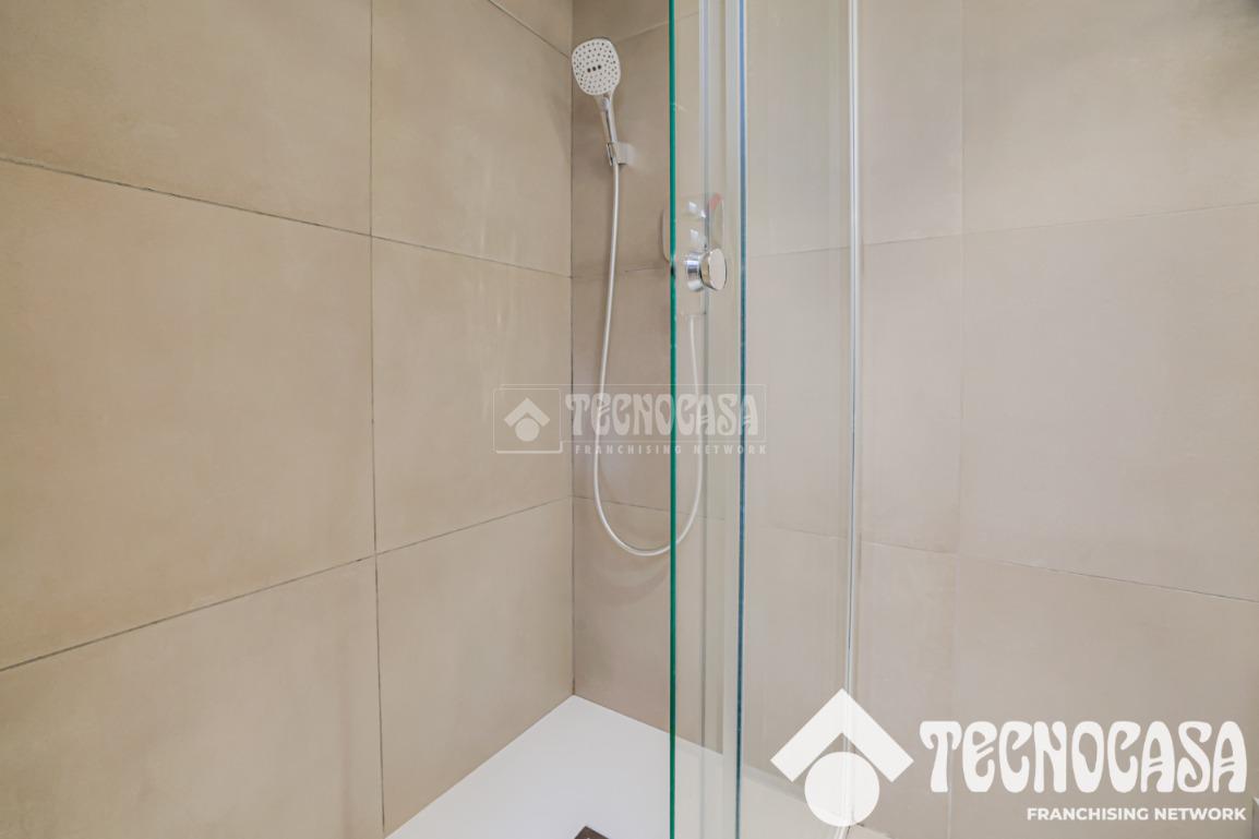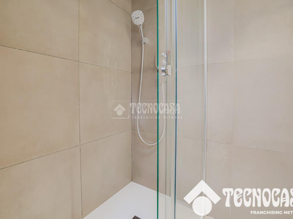 Un pasillo con armarios empotrados conduce a un baño completo, de diseño actual y equipado con un elegante plato de ducha.